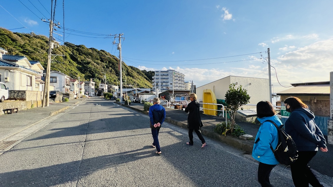 と満足げに皆さん小坪漁港を横目に歩いてサービスに帰る図・・・
