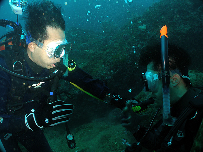 緊急減圧停止時のバックアップ空気源を使っての呼吸練習