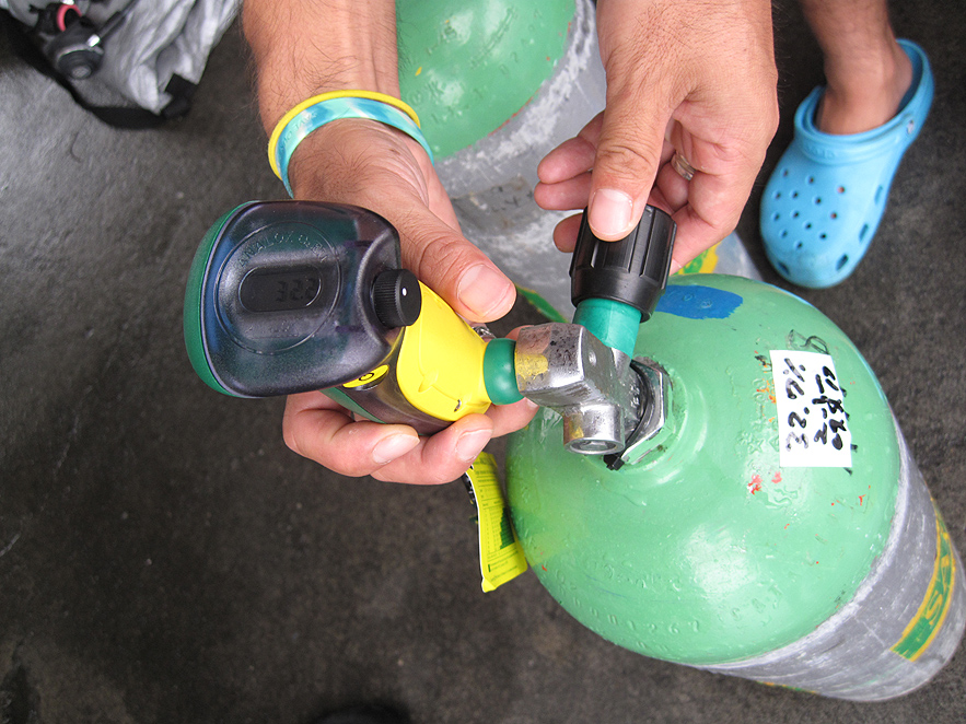 エンリッチドエアーとは、空気よりも酸素濃度が高く、減圧症の影響を受けにくい事から、深場に長い時間滞在できるタンクのことです