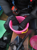 水温は13度なんですが完全防寒で「貼るカイロ」を背中にべたべた
