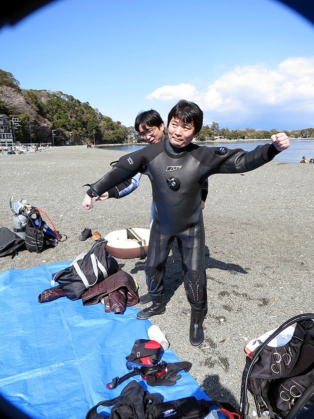 田村さん♪ おNEWのドライスーツ(ご本人曰く「5ミリのワンピース!」)に